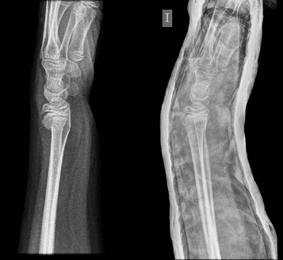 Fractura de radi en un pacient pediàtric. La fractura presentava un desplaçament que va requerir reducció i col·locació de guix per mantenir la reducció fins a la curació.