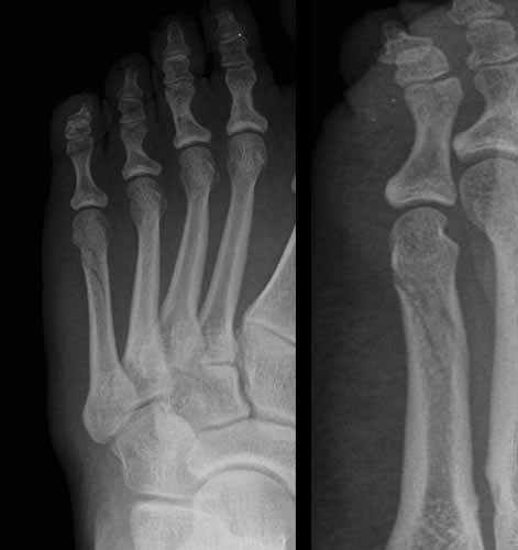 A la imatge: Imatges radiològiques d’una fractura no desplaçada del cinquè metatarsià. En aquest tipus de fractures n’hi haurà prou amb la immobilització amb un guix o una bota ortopèdica per a la seva curació.