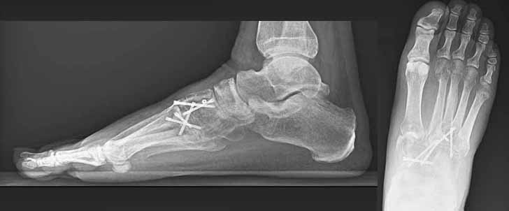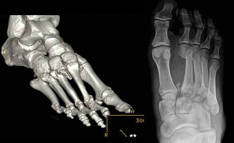 Imatge de radiografia convencional (dreta) i TAC (esquerra) d’unes fractures que afecten l’anomenada articulació de Lisfranc, que comprèn les articulacions del mitjà peu entre les cuixes i els metatarsians. Es tracta de fractures desplaçades que requeriran cirurgia.